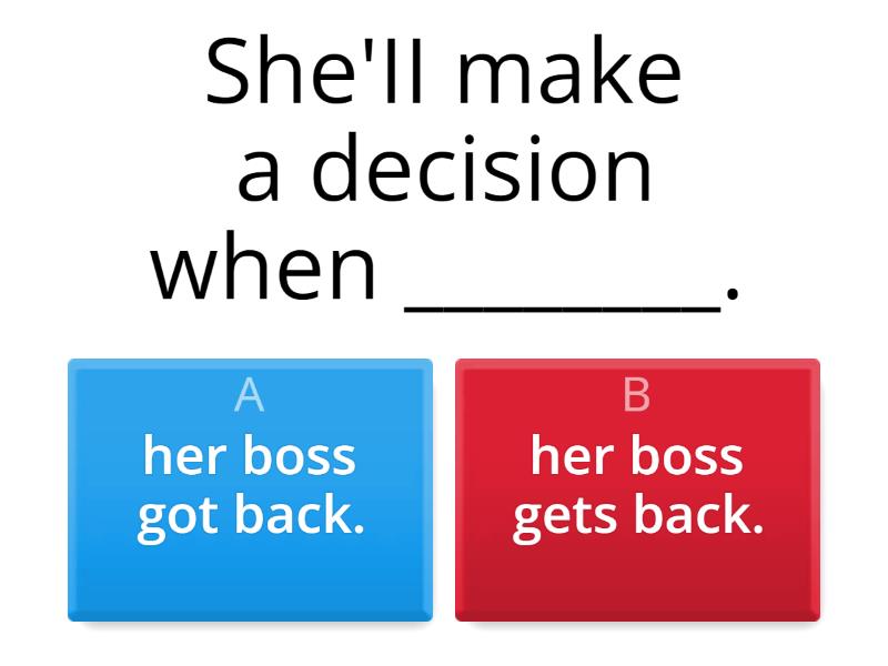 1) She'II make a decision when ________. a) her boss got back. b) her boss gets back. 2) When I ________ my mind, I'll let you know. a) make up b) made up 3) I ________ anything if you help me. a) won't say b) don't say 4) I'll call you when ______. a) I knew what I'm doing. b) I know what I'm doing. 5) If you ________, you want them to be happy and successful. a) have children b) had children 6) If I _____ , I'll buy some food. a) will get hungry b) get hungry 7) If children study all the time, they _______ in other ways. a) don't develop b) didn't develop 8) When I read on buses, I ____ sick. a) feel b) will feel