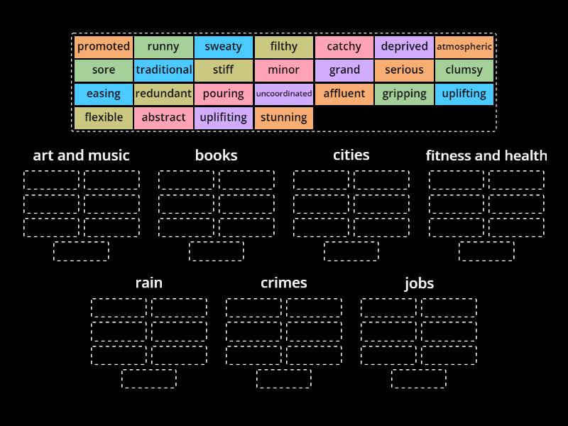 art and music: abstract, traditional, atmospheric, catchy, stunning, uplifiting, books: gripping, uplifting, cities: affluent, deprived, grand, filthy, fitness and health: flexible, runny, uncoordinated, clumsy, sweaty, sore, stiff, rain: pouring, easing, crimes: minor, serious, jobs: redundant, promoted,