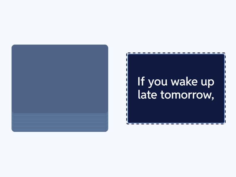 When I’m old,, If you want to speak English well,, When it’s really hot,, When I feel bored,, If Karen/Katie gives me lots of homework today,, When I go to bed tonight,, As soon as Australia/Canada reopens its borders,, If your neighbour annoys you,, If you don’t understand the teacher,, If you have nothing to do tonight,, If my English improves a lot,, If you wake up late tomorrow,, I'm probably going to be angry at you..., I will be up all night..., I won't eat too much chocolate..., If I run out of food at home,, If you order through UberEats this weekend, , If the weather is not so beautiful this weekend, , As soon as class ends, , Before dinner tonight, , If you visit my country,, If I live to be 100 years old,, If I lose or forget my house keys, , If I win the lottery,, When I can afford it, , When I miss my family and friends back home,, When I have a headache,, When I feel homesick, , You'll find the love of your life if..., I'll study really hard as soon as....
