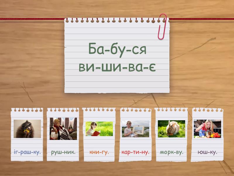 руш-ник. - Ба-бу-ся ви-ши-ва-є, кар-ти-ну. - Єв-ген ма-лю-є, кни-гу. - Є-ва чи-та-є, іг-раш-ку. - Є-нот ма-є, юш-ку. - Ма-ма го-ту-є, морк-ву. - За-єць хру-ма-є,