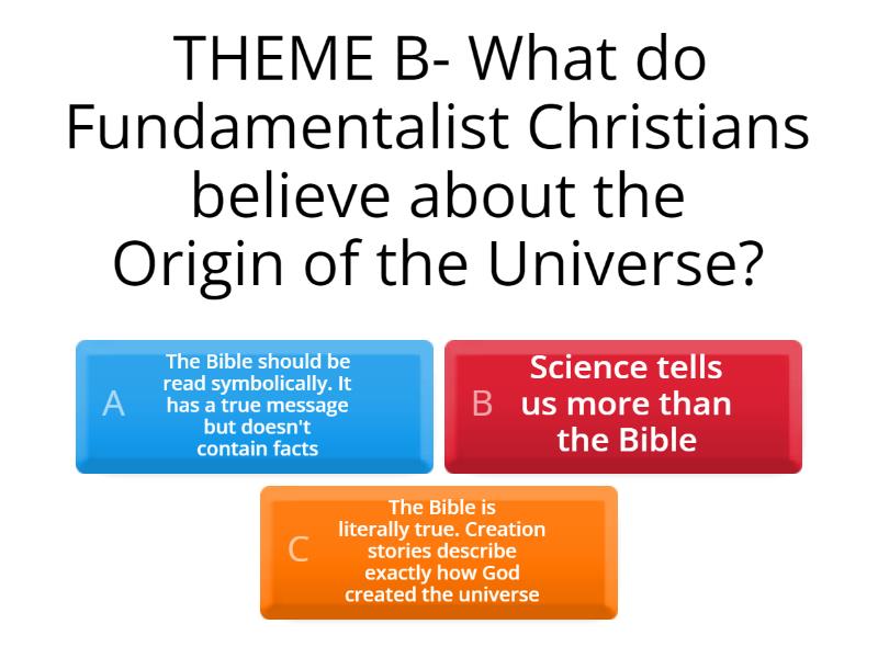 1) THEME B- What do Fundamentalist Christians believe about the Origin of the Universe? a) The Bible should be read symbolically. It has a true message but doesn't contain facts b) Science tells us more than the Bible c) The Bible is literally true. Creation stories describe exactly how God created the universe 2) THEME E- Which of these is the correct definition for crime? a) An offence which is punishable by law b) An offence which is punishable by God c) Something that is legally done to somebody after they have been found guilty 3) THEME B- What is the term for cutting down trees and destroying forests? a) Deforestation b) Stewardship c) Dominion 4) THEME D- What is a conscientious objector? a) A person who refuses to uses violence b) A person who voices their disagreement c) A person who refuses to fight because of their conscience 5) THEME E- The death penalty does not exist in the UK and punishment cannot deliberately harm the offender. Which of these punishments are therefore illegal in the UK? a) Fines b) Prison c) Corporal and Capital punishment 6) THEME D- Which of the following is the idea that everyone should get what they deserve? a) Forgiveness b) Reconciliation c) Justice 7) THEME B-  "Rule over the fish in the sea and the birds in the sky and over every living creature that moves on the ground" (Genesis 1:28) could be used as evidence to support... support.. a) Being a Khalifah b) Stewardship c) Dominion 8) THEME D- Which one of the following is not a reason for war? a) Greed b) Forgiveness c) Retaliation 9) THEME E- Which of the following is not one of the 6 'aims of punishment'? a) Protection b) Deterrence c) Reputation 10) THEME B- Which of these is an example of air pollution? a) Factory fumes b) Fishing c) Recycling