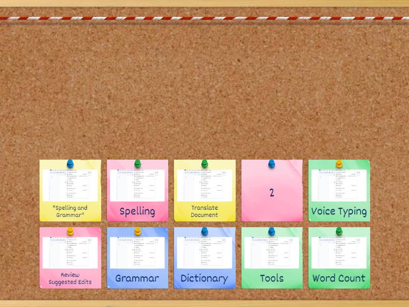 Tools - Where I can find editing functions , Spelling - Red squiggly line , Grammar - Blue squiggly line , "Spelling and Grammar" - Where I can find spelling and grammar suggestions, Word Count - Where I can find out how many words I have, Review Suggested Edits - Where I can review spelling and grammar suggestions, Dictionary  - Where I can find definitions and synonyms, Translate Document - Where I can change the language of my words, Voice Typing - Where I can type while speaking out loud, 2 - How many different editing strategies on a Google Doc are there?,