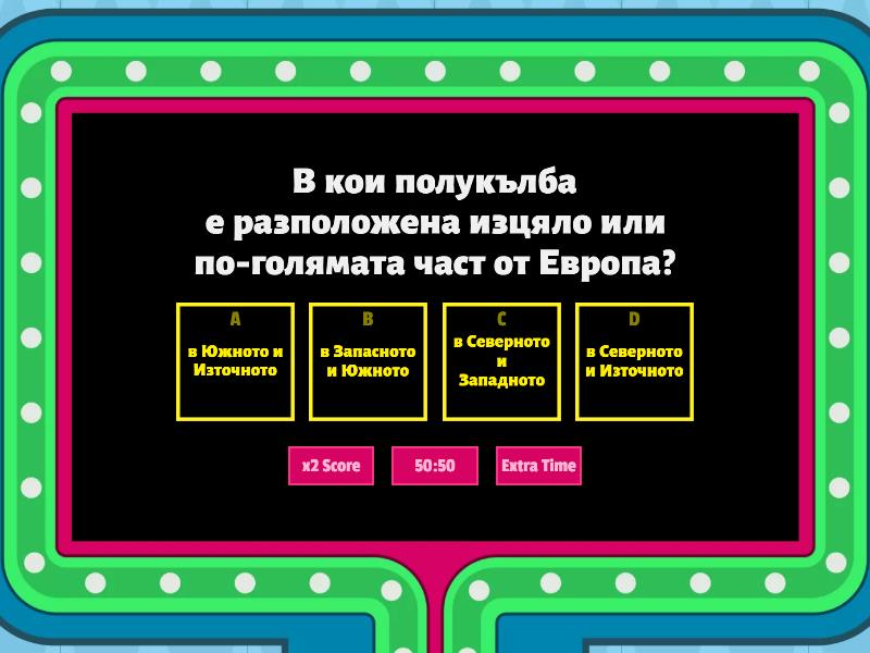 1) В кои полукълба е разположена изцяло или по-голямата част от Европа? a) в Южното и Източното b) в Запасното и Южното c) в Северното и Западното d) в Северното и Източното 2) На колко части се поделя Европа според особеностите на релефа? a) пет b) четири c) шест d) три 3) Кой от климатичните пояси в Европа обхваща по-голямата част от територията на континента? a) субполярен b) субтропичен c) полярен d) умерен 4) Най-голямото езеро в Европа е: a) Ладожкото b) Охридското c) Женевското d) Балатон 5) Кое определение се отнася за понятието природна зона? a) Малки части от сушата, в които е възможно да има живот. b) Места, в които има всички необходими условия за живот. c) Ивици от сушата със сходни условия за живот. d) Ивици от сушата със сходен климат. 6) Коя е най-многобройната езикова група в Европа? a) романска b) славянска c) угро-финска d) германска 7) С коя цифра е обозначено местоположението на Франция? a) 3 b) 4 c) 2 d) 1 8) Кое от твърденията за границите на Русия НЕ е вярно? a) Южната граница на страната е сухоземна. b) Русия граничи с два океана. c) На юг Русия граничи с Черно и Баренцово море. d) Русия граничи с общо 16 страни в Европа и Азия. 9) Каква е Италия по форма на държавно управление? a) абсолютна монархия b) конституционна монархия c) република d) теократична монархия 10) Кой народ обитава северните части на Скандинавския полуостров и е неговото коренно население? a) ненци b) саами c) маври d) татари 11) Кой е най-големият остров, отнасящ се към Балканския полуостров? a) Евбея b) Крък c) Тасос d) Крит 12) Кои води на сушата НЕ са представени на Балканския полуостров? a) ледници b) подземни води c) езера d) реки 13) Кои територии на Балканския полуостров се отличават с малка гъстота на населението? a) някои острови в Егейско море b) районите около големите градове и индустриалните центрове c) крайбрежията d) поречията на реките Дунав, Сава, Марица 14) Кой от изброените фактори определя разнообразието на природните условия на Балканския полуостров? a) екологична обстановка b) географско положение c) климат d) природни ресурси 15) Каква страна е Македония по форма на държавно управление? a) теократична монархия b) парламентарна република c) абсолютна монархия d) конституциона монархия 16) България е разположена в ... част на Европа, и в ... част на Балканския полуостров? a) югозападната, северозападната b) югоизточната, североизточната c) североизточната, западната d) западната, югозападната 17) Кои от посочените земеповърхни форми НЕ са характерни за съвременния релеф на България? a) пустини b) равнини c) котловини d) планини 18) Основните екологични проблеми при добива на полезни изкопаеми са: a) замърсяване на въздуха, почвите и водите b) унищожаване на обработваеми земи c) всички изброени d) образуват се нови форми на релефа 19) Кой тип въздушни маси НЕ формира климата в България? a) екваториални b) тропични c) арктични d) умерени 20) Най-дългата река в България е? a) Искър b) Струма c) Камчия d) Марица 21) Кой почвен тип е най-разпространен в България? a) черноземни b) смолници c) канелени d) алувиално-ливадни 22) Кое от изброените растения е ендемит? a) трепетлика b) лавровишня c) черна мура d) рилска иглика 23) Дунавската равнина се поделя на няколко части. Коя от тях е с най-голяма надморска височина? a) крайбрежната b) източната c) западната d) средната 24) С коя цифра е отбелязана природната област Стара планина на картата? a) 1 b) 2 c) 3 d) 4 25) Какъв е пр