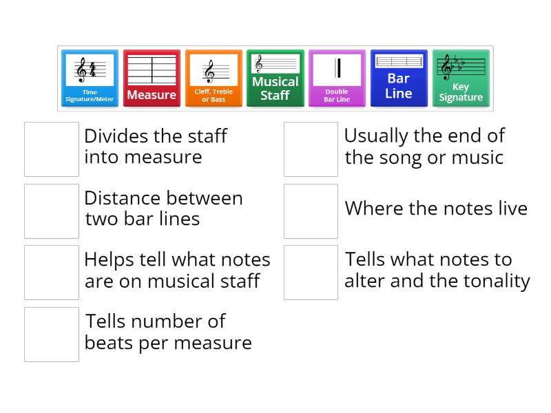 Cleff, Treble or Bass - Helps tell what notes are on musical staff, Musical Staff - Where the notes live, Time Signature/Meter - Tells number of beats per measure, Key Signature - Tells what notes to alter and the tonality, Bar Line - Divides the staff into measure, Measure - Distance between two bar lines, Double Bar Line - Usually the end of the song or music,