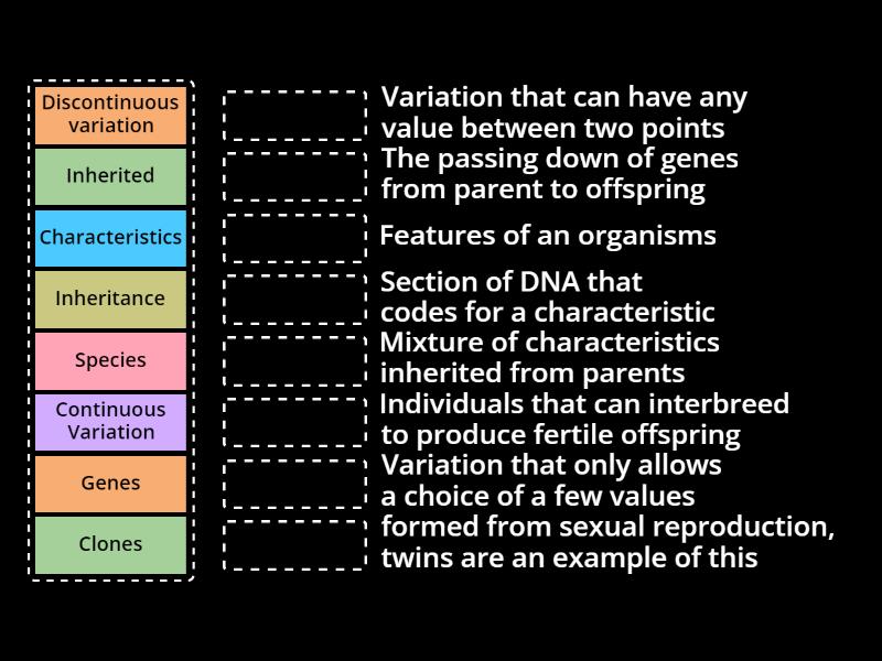 Genes - Section of DNA that codes for a characteristic, Clones - formed from sexual reproduction, twins are an example of this, Inheritance - The passing down of genes from parent to offspring, Continuous Variation - Variation that can have any value between two points, Discontinuous variation - Variation that only allows a choice of a few values, Characteristics - Features of an organisms, Species - Individuals that can interbreed to produce fertile offspring, Inherited - Mixture of characteristics inherited from parents,