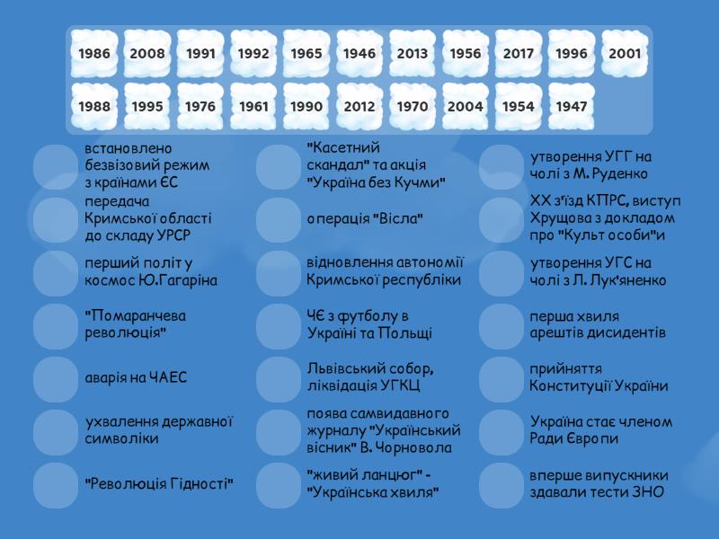 1946 - Львівський собор, ліквідація УГКЦ, 1947 - операція "Вісла", 1954 - передача Кримської області до складу УРСР, 1956 - ХХ з'їзд КПРС, виступ Хрущова з докладом про "Культ особи"и, 1961 - перший політ у космос Ю.Гагаріна, 1965 - перша хвиля арештів дисидентів , 1970 - поява самвидавного журналу "Український вісник" В. Чорновола, 1976 - утворення УГГ на чолі з М. Руденко , 1986 - аварія на ЧАЕС, 1988 - утворення УГС на чолі з Л. Лук'яненко , 1990 - "живий ланцюг" - "Українська хвиля", 1991 - відновлення автономії Кримської республіки , 1992 - ухвалення державної символіки , 1995 - Україна стає членом Ради Європи , 1996 - прийняття Конституції України , 2001 - "Касетний скандал" та акція "Україна без Кучми", 2004 - "Помаранчева революція", 2008 - вперше випускники здавали тести ЗНО, 2012 - ЧЄ з футболу в Україні та Польщі , 2013 - "Революція Гідності", 2017 - встановлено безвізовий режим з країнами ЄС,
