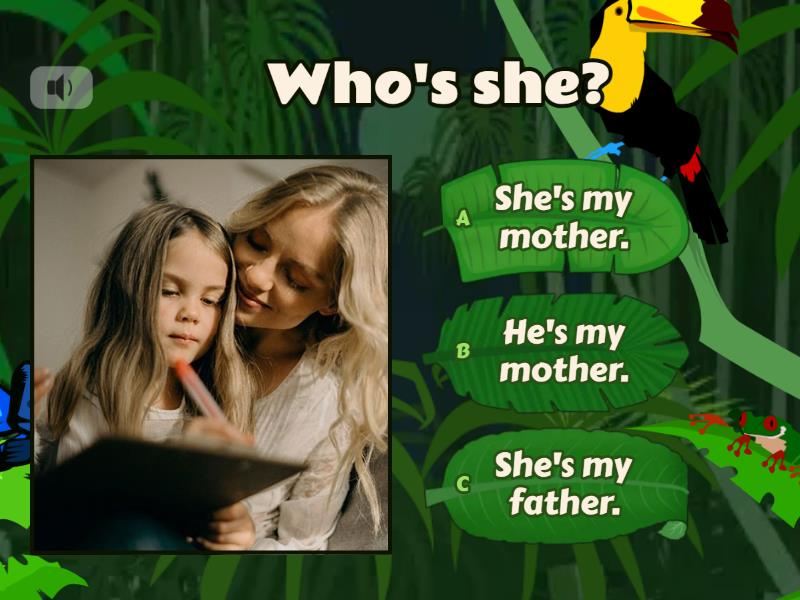 1) Who's she? a) She's my mother. b) He's my mother. c) She's my father. 2) Are you a student? a) Yes, I am. b) No, I'm not. c) No, I am. 3) Who's she? a) He's my grandmother. b) She's my granfather. c) She's my grandmother. 4) Is he a teacher? a) Yes, she is. b) Yes, he is. c) Yes, you are. 5) She's my mother. a) b) c) 6) Is he a driver? a) Yes, she is. b) Yes, he is. c) No, he's not. 7) Who's she? a) She's my mother. b) She's my sister. c) She's my grandma. 8) Is he a cook? a) Yes, he is. b) Yes, she is. c) Yes, you are. 9) Am I a nurse? a) Yes, I am. b) No, I'm not. c) No , he's not. 10) Are you a student? a) Yes, she is. b) Yes, I am. c) Yes, he is.