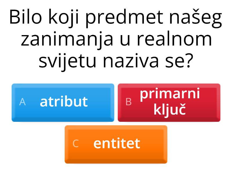 1) Bilo koji predmet našeg zanimanja u realnom svijetu naziva se? a) atribut b) primarni ključ c) entitet 2) Baza podataka je sustav koji sadrži određenu količinu organiziranih podataka. a) Točno b) Netočno 3) Što znači DBMS? a) Data build maker system b) Data base management system c) Data base maker system 4) Svaki entitet ima svoje a) atribute b) baze c) podatke d) pridjeve 5) Najmanja logička cjelina podataka STUPAC ima drugi naziv? a) zapis b) polje 6) Relacija kojeg tipa znači da svakom slogu u prvoj tablici odgovara najviše jedan slog u drugoj tablici? a) 0:N b) N:N c) 1:N d) 1:1 7) Koji postupak nije potreban kod izrade kvalitetne baze podataka? a) analiziranje potreba korisnika b) kreiranje modela baze podataka c) planiranje broja podataka d) održavanje podataka 8) Između postojećih tablica potrebno je uspostaviti? a) primarni ključ b) atribute c) relacije 9) Struktura relacijskih baza podataka temelji se na nizu? a) Grupnih tablica b) Samostalnih tablica 10) Baza podataka izrađuje se na kojem microsoft programu? a) ACCESS b) EXCEL c) WORD