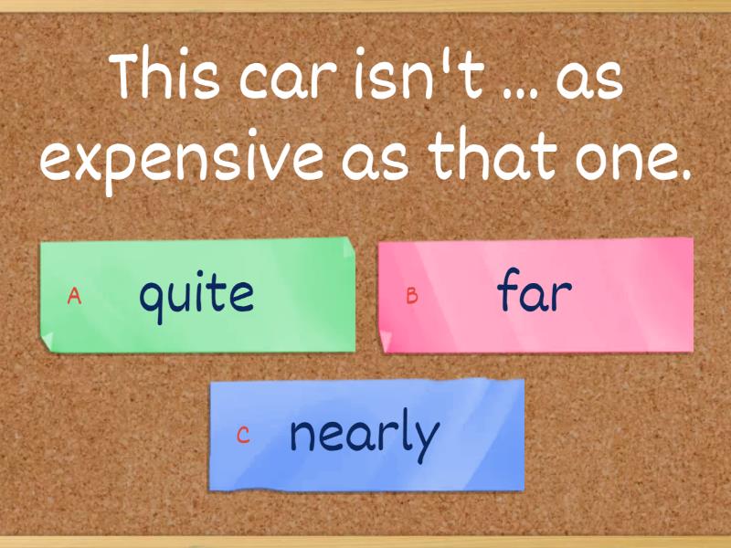 1) This car isn't ... as expensive as that one. a) quite b) far c) nearly 2) The government thinks spending money on hospitals would be ... more effective than spending it on the military. a) a lot b) worse c) bit 3) The group thinks that doing homework would be ... less fun than playing video games. a) worse b) little c) a lot 4) I don't think Rome is ...... Naples a) quite sunnier than b) as sunny as c) nearly as sunny as 5) My boss thinks attending a conference would be ... more enjoyable than watching it online. a) such b) far c) little 6) He is still ... than other businessman in the world. a) easily rich b) far richer c) a lot more rich d) miles richer 7) The film is .... than the book. a) as bad than b) slightly worser c) a bit worse d) a bit as bad as 8) My new smartphone is ... the old one. a) much better then b) far better than c) miles better than d) much more better than e) as better as 9) It is usually ..... here than this summer. a) a bit hotter b) a bit as hot c) as hot as d) slightly hot e) slightly hotter 10) Watching films in English is .... than in my own language a) slightly difficult b) more difficult c) a bit more difficult d) much difficult e) far more difficult