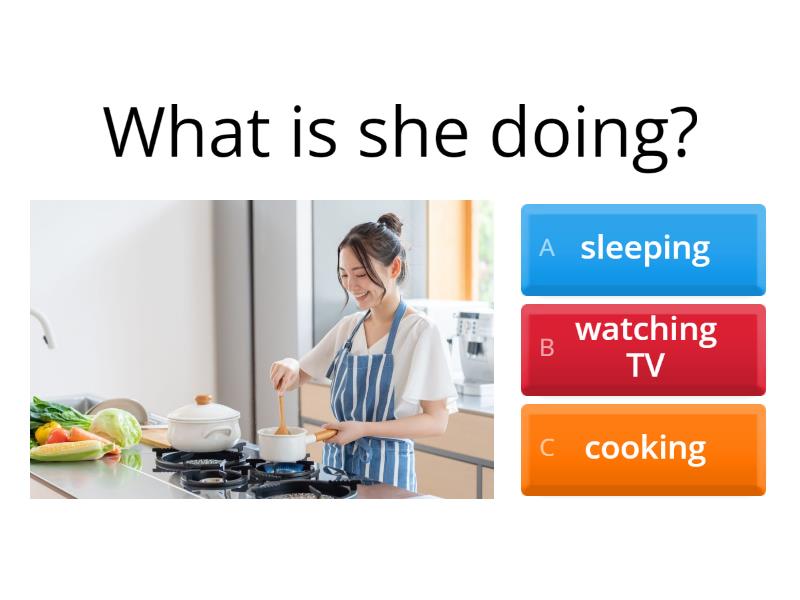 1) What is she doing? a) sleeping b) watching TV c) cooking 2) What is she doing? a) She's cleaning b) She's cooking c) She's eating 3) What is he doing? a) He's eating b) He's cooking c) HE's sleeping 4) Where is she ? a) she is in the bathroom b) She is in the living room c) She is in the Kitchen 5) Where are they?  a) They're in the bedroom b) There're in the dining room c) There're in the bathroom 6) What are they doing? a) they are eating in the kitchen b) they are taking a bath in the bathroom c) They are sleeping in the bedroom 7) What is the girl doing? a) She is taking a bath in the bathroom b) She is eating in the dining room c) she is cooking in the kitchen