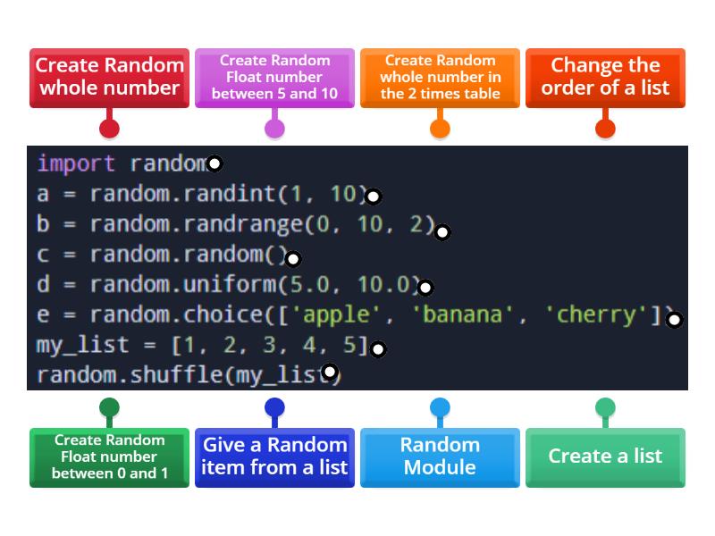 Random Module, Create Random whole number, Create Random whole number in the 2 times table, Create Random Float number between 0 and 1, Create Random Float number between 5 and 10, Give a Random item from a list, Create a list, Change the order of a list.