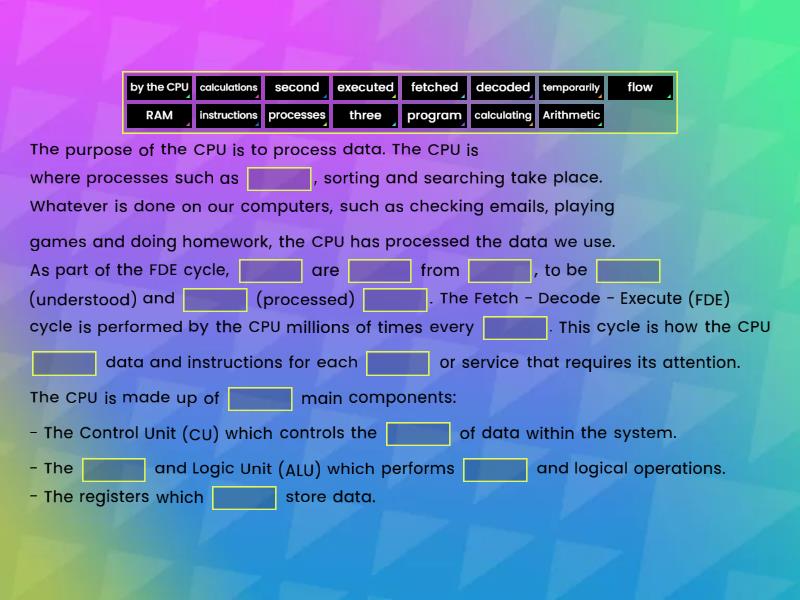 The purpose of the CPU is to process data. The CPU is where processes such as ____, sorting and searching take place. Whatever is done on our computers, such as checking emails, playing games and doing homework, the CPU has processed the data we use. As part of the FDE cycle, ____ are ____ from ____, to be ____ (understood) and ____ (processed) ____. The Fetch - Decode - Execute (FDE) cycle is performed by the CPU millions of times every ____. This cycle is how the CPU ____ data and instructions for each ____ or service that requires its attention. The CPU is made up of ____ main components: - The Control Unit (CU) which controls the ____ of data within the system. - The ____ and Logic Unit (ALU) which performs ____ and logical operations. - The registers which ____ store data.