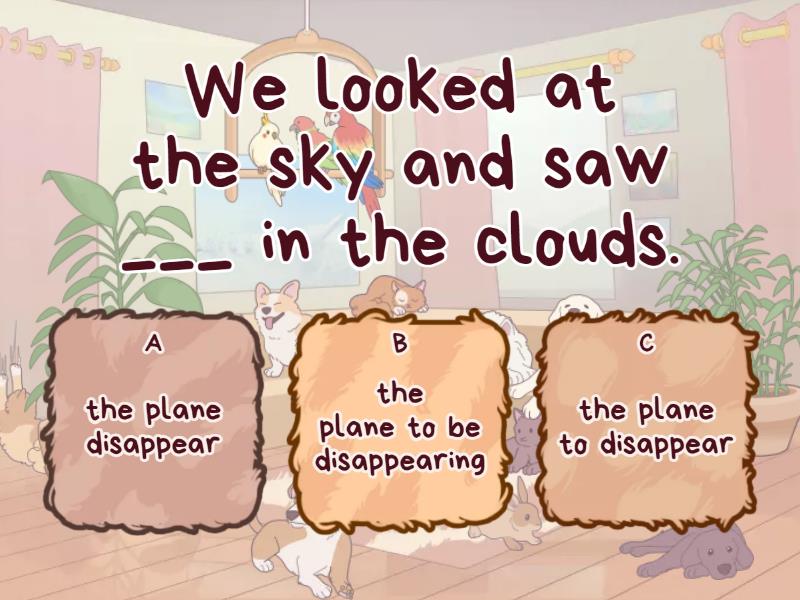 1) We looked at the sky and saw ___ in the clouds. a) the plane disappear b) the plane to be disappearing c) the plane to disappear 2) We expect the Chinese delegation ____ tomorrow. a) leaving b) to leaving c) to leave 3) Mr. Smith didn"t want his daughter ____ an actress. a) become b) to become c) becoming 4) We expected ____ in water polo championship. a) them to take part b) they to take part c) them take part 5) Mrs. Edwards usually ___ at home when he feels sick. a) let her son stay b) lets her son stay c) lets het son to stay 6) Betty felt ___ to tremble. a) her hands begin b) her hands to begin c) her hands to beginning 7) Linda is being very rude. I have never heard ___ to her mother like that before. a) that she talk b) her talk c) her to talk 8) I don"t want ___ your grandfather. It's very impolite of you. a) that you disturb b) you disturb c) you to disturb 9) The children are making too much noise. I"d like ___ quiet. a) they to be b) them to be c) that they be 10) The last drop makes ___. a) the cup run over b) the cup running over c) the cup to run over 11) I saw her ... into the building. (входила) a) to come b) coming c) come 12) Can I ... here? a) have my vacuum-cleaner repaired b) repair my vacuum-cleaner c) make my vacuum-cleaner repaired 13) I believed you ... three mobile phones. a) to have b) having c) have 14) He made me ... the window. a) to close b) closing c) close 15) I saw them ... in the park. a) to play b) playing c) play 16) She believes Mark ... a good guy. a) to be b) being c) be 17) I saw you ... in the park. Everybody liked it! a) to dance b) to dancing c) dancing 18) His mum wants him ... his homework. a) to do b) doing c) do 19) Shh! I hear someone ... . a) cry b) to cry c) crying 20) I ... before the wedding. a) cut my hair b) had my hair cut c) had cut my hair 21) He can’t make me ... this! a) to do b) doing c) do 22) I'd like him ... this task so well. a) to do b) do c) doing 23) His mum allowed him … home late tonight. a) to come b) coming c) come 24) Mr. Brown would like his son ... a surgeon. a) to become b) becoming c) become 25) I want my son ... more languages. a) to learn b) learning c) learn 26) Don’t let him ... you. a) to fool b) fooling c) fool 27) I expect the weather ... good today. a) to be b) being c) be 28) I heard her ... a famous English song. a) to sing b) singing c) sing 29) I know her ... a good student. a) to be b) being c) be 30) Rainy weather makes me ... bad. a) to feel b) feeling c) feel