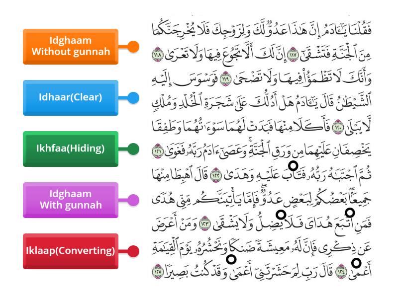 Idhaar(Clear), Iklaap(Converting), Idghaam Without gunnah, Ikhfaa(Hiding), Idghaam With gunnah.