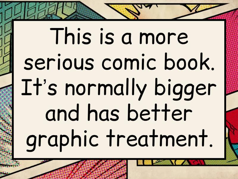 Special edition with hard covers and normally high quality paper. - hard cover edition, A story that develops in the course of several editions. - story arc, This is the “assistant” of the main hero in a comic book. He or she is normally younger and has the main hero as a sort of mentor. - sidekick, A rare or a special edition of a comic book that is highly sought after and hard to find. Also applies for derivate products like action figures and memorabilia. - collectible, In comics, this is the official storyline that is known and accepted by the community of artists and fans. - canon, This is a character who is an antithesis of the classical hero. They get in trouble, they get sick, and they often don’t get happy endings. - anti-hero, This is a more serious comic book. It’s normally bigger and has better graphic treatment. - graphic novel, It's simply the Japanese word for comic. The term is used to describe all Japanese and other Asian comics in general. It is normally black and white, and you read it backwards, as the Japanese do. - manga, This is when story elements of two or more comic books come together to create one storyline across multiple titles. - crossover, This is a mega crossover story. Plots normally involve wars, alien invasions, heroes fighting other heroes, death (and return) of important characters, and so on. The outcome of the storyline often affects on-going titles for months and sometimes years to come. - event, Comics that are made for viewing on the Internet. This could be in a comic strip format or as an on-going narrative. - webcomic,