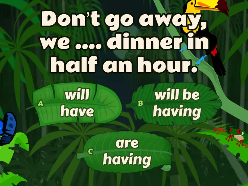 1) Don’t go away, we .... dinner in half an hour. a) will have b) will be having c) are having 2) I hope you …. make any mistakes in your final test. a) don’t b) won’t c) aren’t 3) He’s seriously ill. He .... in bed for the next week. a) stays b) will stay c) will be staying 4) Don't worry, I ..... it without your help. a) will do b) will be doing c) will have done 5) I hope you …… your project by the conference next week. a) will finish b) will be finishing c) will have finished 6) See you soon. Remember we ….. next Monday. a) are meeting b) will meet c) will be meeting 7) Don’t disturb me tomorrow. I ….. all day long. a) will work b) will be working c) will have worked 8) If you ..... your breakfast you will be hungry later. a) don’t eat b) aren’t eating c) won't eat 9) I hope they …… by the wedding ceremony. a) arrive b) will arrive c) will have arrived 10) I ….. for you if you are late. a) wait b) will be waiting c) will have waited 11) I definitely know that this shop..... at 10 o’clock. a) opens b) is opening c) will have opened 12) At this time tomorrow we ….. in the sea. a) swim b) are swimming c) will be swimming 13) We have already decided. This year we .... to the mountains or holiday. a) are going b) will be going c) will have gone 14) Today is football final match. Of course, I …. it. a) watch b) will be watching c) will have watched 15) Do you think you …. your work on time? a) finish b) will be finishing c) will have finished 16) If you lose your job I ….. you to find the new one. a) help b) am helping c) will help 17) It’s too late. The film ….. by the time we get to the cinema. a) finishes b) will finish c) will have finished 18) — Sorry, I’ve forgotten my phone.- Don’t worry, I …… you mine. a) give b) will give c) am giving 19) He is very busy this morning. He …… his report for the boss. a) writes b) will write c) will be writing 20) Ann has already booked the hotel, she ….. in the morning. a) is leaving b) will leave c) will have left 21) Stay here untill our train ... a) will arrive b) arrives c) will have arrived