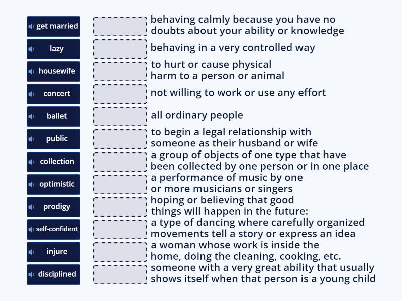 ballet - a type of dancing where carefully organized movements tell a story or express an idea, collection - a group of objects of one type that have been collected by one person or in one place, concert - a performance of music by one or more musicians or singers, disciplined - behaving in a very controlled way, get married - to begin a legal relationship with someone as their husband or wife, injure - to hurt or cause physical harm to a person or animal, lazy - not willing to work or use any effort, public - all ordinary people, self-confident - behaving calmly because you have no doubts about your ability or knowledge, optimistic - hoping or believing that good things will happen in the future:, prodigy - someone with a very great ability that usually shows itself when that person is a young child, housewife - a woman whose work is inside the home, doing the cleaning, cooking, etc.,