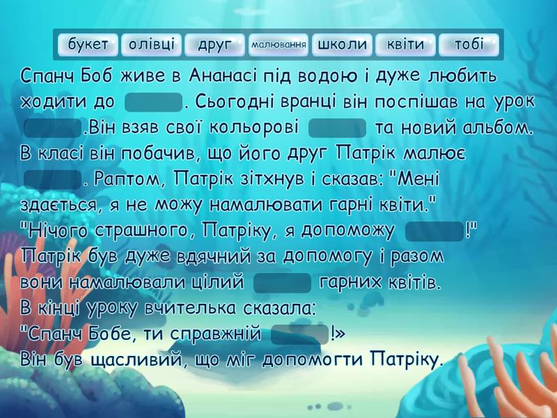 Спанч Боб живе в Ананасі під водою і дуже любить ходити до ____. Сьогодні вранці він поспішав на урок ____.Він взяв свої кольорові ____ та новий альбом. В класі він побачив, що його друг Патрік малює ____. Раптом, Патрік зітхнув і сказав: "Мені здається, я не можу намалювати гарні квіти." "Нічого страшного, Патріку, я допоможу ____!" Патрік був дуже вдячний за допомогу і разом вони намалювали цілий ____ гарних квітів. В кінці уроку вчителька сказала: "Спанч Бобе, ти справжній ____!» Він був щасливий, що міг допомогти Патріку.