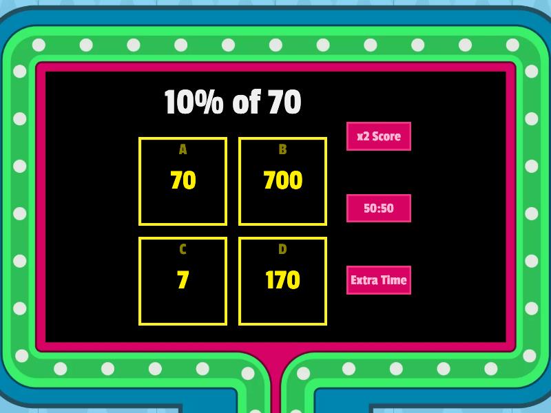 1) 10% of 70 a) 70 b) 700 c) 7 d) 170 2) 10% of 30 a) 10 b) 15 c) 60 d) 3 e) 300 3) 1% of 400 a) 4 b) 40 c) 400 d) 2 e) 20 f) 200 4) 1% of 500 a) 50 b) 55 c) 0.5 d) 5 5) 10% of 120 a) 12 b) 1.2 c) 10 d) 120 6) 10% of 400 a) 400 b) 40 c) 4 d) 100 e) 200 7) 1% of 1200 a) 1.2 b) 1000 c) 1 d) 12 e) 120 8) 1% of 3800 a) 1000 b) 3.8 c) 38 d) 380 e) 100 9) 10% of 500 a) 50 b) 40 c) 30 d) 20 e) 10 f) 5 10) 10% of 180 a) 18 b) 10 c) 180 d) 36 e) 100 11) 1% of 1800 a) 18 b) 10 c) 180 d) 36 e) 9 f) 100