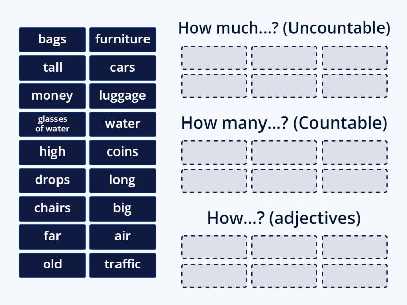 How much...? (Uncountable): water, money, traffic, air, furniture, luggage, How many...? (Countable): glasses of water, coins, cars, chairs, bags, drops, How...? (adjectives): tall, big, high, old, long, far,