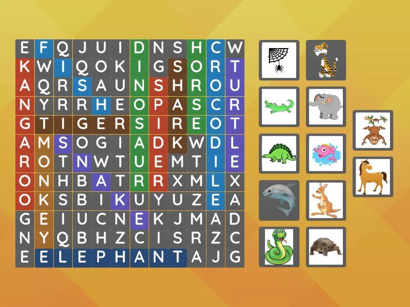 dinosaur, snake, spider, crocodile, tiger, elephant, monkey, horse, turtle, kangaroo, fish, shark,