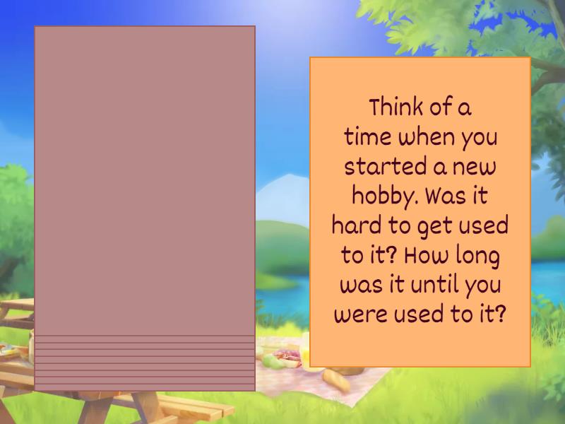 : What is something that you used to do as a child but no longer do now?, Name five things that you are used to doing every day., Think of a time when you started a new hobby. Was it hard to get used to it? How long was it until you were used to it?, Imagine you have to move to a new city. Do you think you’ll have a hard time getting used to living there? How about another country?, What types of TV shows did you use to watch when you were younger? What do you enjoy watching nowadays?, Did you use to believe anything that you don't believe now?, What is a type of food that you are not used to eating?, What is an activity which you weren't used to in the past, but which you are used to now?, How long did it take you to get used to reading comfortably in English?, What is something that you got used to very quickly?,