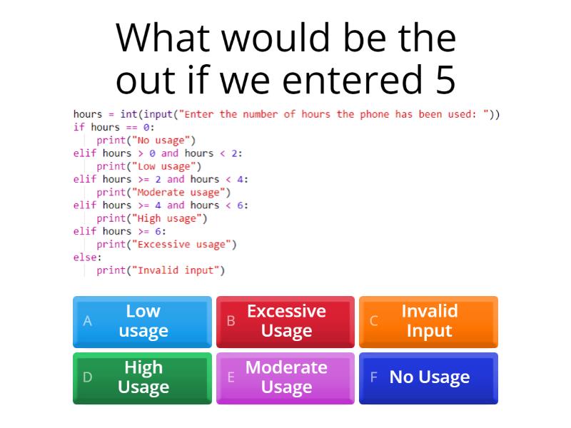 1) What would be the out if we entered 0 a) Low usage b) Moderate Usage c) High Usage d) Excessive Usage e) No Usage f) Invalid Input 2) What would be the out if we entered 1 a) Low usage b) Moderate Usage c) High Usage d) Excessive Usage e) No Usage f) Invalid Input 3) What would be the out if we entered 2 a) Low usage b) Moderate Usage c) High Usage d) Excessive Usage e) No Usage f) Invalid Input 4) What would be the out if we entered 3 a) Low usage b) Moderate Usage c) High Usage d) Excessive Usage e) No Usage f) Invalid Input 5) What would be the out if we entered 4 a) Low usage b) Moderate Usage c) High Usage d) Excessive Usage e) No Usage f) Invalid Input 6) What would be the out if we entered 5 a) Low usage b) Moderate Usage c) High Usage d) Excessive Usage e) No Usage f) Invalid Input 7) What would be the out if we entered 6 a) Low usage b) Moderate Usage c) High Usage d) Excessive Usage e) No Usage f) Invalid Input 8) What would be the out if we entered -1 a) Low usage b) Moderate Usage c) High Usage d) Excessive Usage e) No Usage f) Invalid Input 9) What would be the out if we entered one a) Low usage b) Moderate Usage c) High Usage d) Excessive Usage e) No Usage f) Invalid Input 10) What would be the out if we entered 3.1 a) Low usage b) Moderate Usage c) High Usage d) Excessive Usage e) No Usage f) Invalid Input