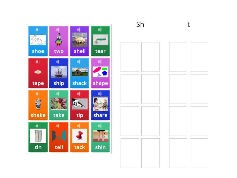 Sh: shin, shell, shape, shack, ship, share, shoe, shake, t: take, tear, tell, tape, tin, two, tip, tack,