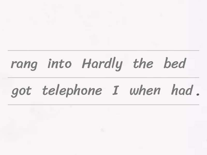 Hardly had I got into bed when the telephone rang., Never (before) had she seen such a beautiful sight., Not until I saw John with my own eyes did I really believe he was safe.., Not since Lucy left college had she had such a wonderful time., Only later did she really think about the situation., No sooner had we arrived home than the police rang the doorbell., Scarcely had I got off the bus when it crashed into the back of a car., Nowhere have I ever had such bad service., Only in this way could John earn enough money to survive., On no account should you do anything without asking me first.,