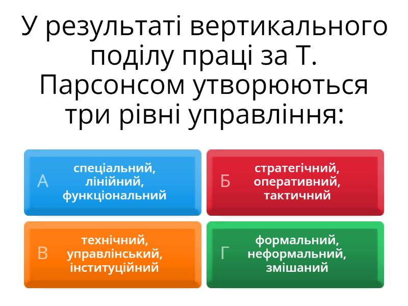 1) У результаті вертикального поділу праці за Т. Парсонсом утворюються три рівні управління: a) спеціальний, лінійний, функціональний b) стратегічний, оперативний, тактичний c) технічний, управлінський, інституційний d) формальний, неформальний, змішаний 2) Залежно від реакції на зміни зовнішнього середовища розрізняють: a) комерційні та некомерційні організації b) механістичні, адаптивні та інноваційні організації c) національні, іноземні та змішані організації d) формальні та неформальні організації 3) Розподіл праці на одному рівні управління з метою кращого виконання завдання – це визначення: a) ієрархічного поділу праці b) вертикального поділу праці c) горизонтального поділу праці d) кваліфікаційного поділу праці 4) Менеджмент починається з: a) постановки цілей b) розподілу робіт серед виконавців c) стимулювання персоналу d) раціонального розподілу ресурсів 5) Організація – це група людей, діяльність яких свідомо чи спонтанно координується задля досягнення: a) ринкових позицій b) конкурентних переваг c) спільної мети d) прибутку 6) Здатність кваліфіковано, професійно, зі знанням справи виконувати роботу на своїй ділянці, знання технічних прийомів конкретної діяльності – це: a) діагностичні здібності менеджера b) аналітичні здібності менеджера c) технічні здібності менеджера d) концептуальні здібності менеджера 7) До внутрішніх змінних організації належать: a) люди (персонал) b) структура організації, завдання c) ціль, технологія d) усі відповіді правильні 8) В організації менеджери виконують: a) ролі, пов’язані з прийняттям рішень b) інформаційні ролі c) міжособистісні ролі d) усі відповіді правильні 9) Інноваційна функція менеджера полягає в тому, що він: a) регулює та координує індивідуальні зусилля працівників організації з подальшою трансформацією та переводом у єдиний упорядкований організаційний процес b) створює атмосферу психологічного комфорту c) упроваджує інновації в процес управління d) представляє свій колектив на різних рівнях внутрішньої організаційної вертикалі та горизонталі 10) Складний процес, який включає цілеспрямований вплив на об’єкти, системи з метою збереження їх сталості або переведення з одного стану в інший для досягнення певних цілей, – це: a) управління b) планування c) регулювання d) контролювання