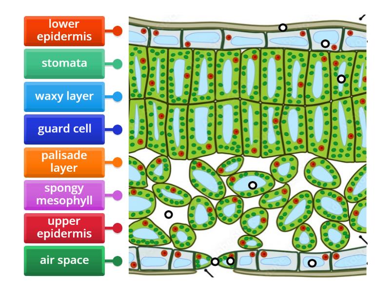 waxy layer, upper epidermis, palisade layer, air space, spongy mesophyll, guard cell, stomata, lower epidermis.
