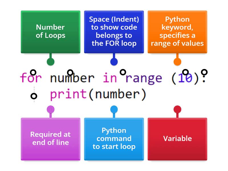 Python command to start loop, Variable, Python keyword, specifies a range of values, Number of Loops, Required at end of line, Space (Indent) to show code belongs to the FOR loop.