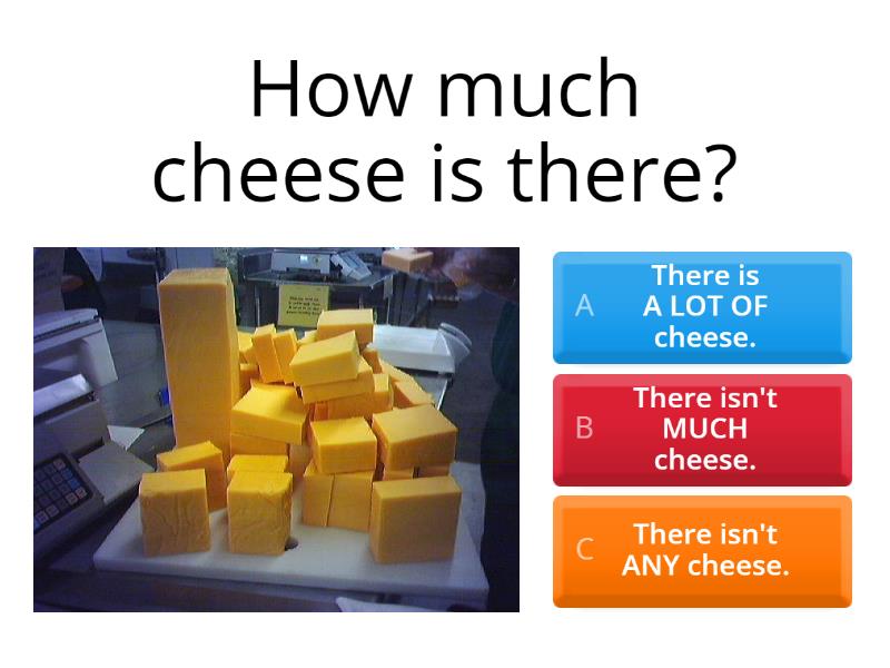 1) How much cheese is there? a) There is A LOT OF cheese. b) There isn't MUCH cheese.  c) There isn't ANY cheese. 2) How many potatoes are there? a) There are A LOT OF potatoes. b) There aren't MANY potatoes. c) There aren't ANY potatoes. 3) How much oil is there? a) There is A LOT OF oil. b) There isn't MUCH oil. c) There isn't ANY oil. 4) How many crisps are there? a) There are A LOT OF crisps. b) There aren't MANY crisps. c) There aren't ANY crisps 5) How much celery is there? a) There is A LOT OF celery. b) There isn't MUCH celery. c) There isn't ANY celery. 6) How many eggs are there? a) There are A LOT OF eggs. b) There aren't MANY eggs. c) There aren't ANY eggs. 7) How much bread is there? a) There is A LOT OF bread. b) There isn't MUCH bread. c) There isn't any bread. 8) How many onions are there? a) There are A LOT OF onions. b) There aren't MANY onions. c) There aren't ANY onions.