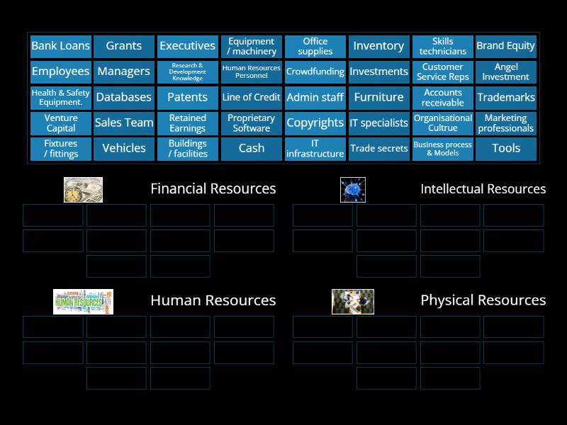 Financial Resources: Accounts receivable , Cash, Bank Loans, Investments, Retained Earnings, Grants, Venture Capital, Line of Credit, Crowdfunding, Angel Investment, Intellectual Resources: Organisational Cultrue, Patents, Trademarks, Copyrights, Trade secrets, Proprietary Software, Databases, Brand Equity, Research & Development Knowledge, Business process & Models, Human Resources: Employees, Managers, Executives, Admin staff, Sales Team, Marketing professionals, Customer Service Reps, Human Resources Personnel, IT specialists, Skills technicians , Physical Resources: Buildings / facilities , Equipment / machinery , Vehicles, Furniture, IT infrastructure, Office supplies, Inventory, Tools, Fixtures / fittings , Health & Safety Equipment. ,