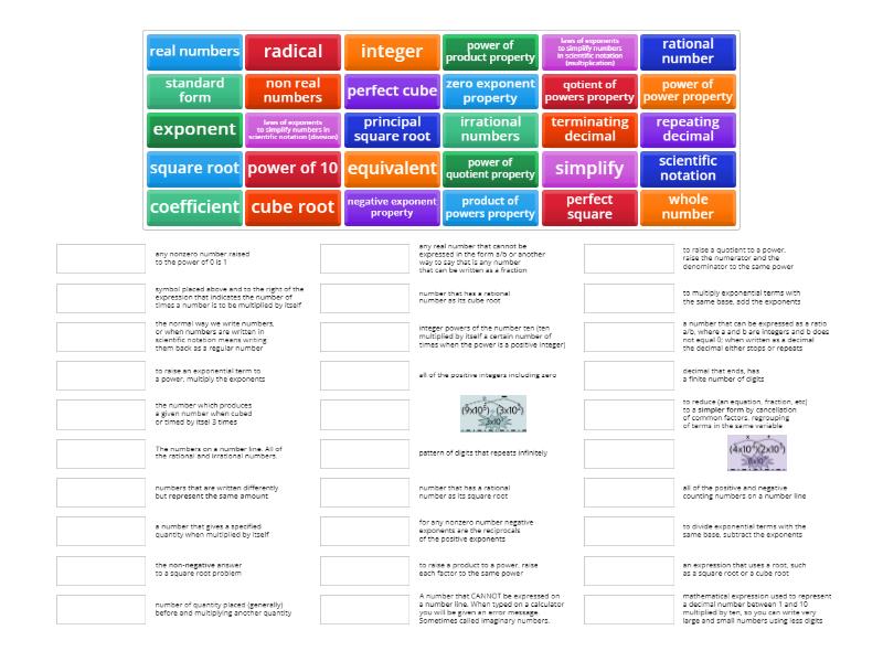 square root - a number that gives a specified quantity when multiplied by itself, cube root - the number which produces a given number when cubed or timed by itsel 3 times, real numbers - The numbers on a number line. All of the rational and irrational numbers. , non real numbers - A number that CANNOT be expressed on a number line. When typed on a calculator you will be given an error message. Sometimes called imaginary numbers. , whole number - all of the positive integers including zero, integer - all of the positive and negative counting numbers on a number line, exponent - symbol placed above and to the right of the expression that indicates the number of times a number is to be multiplied by itself, power of power property - to raise an exponential term to a power, multiply the exponents, power of product property - to raise a product to a power, raise each factor to the same power, power of quotient property - to raise a quotient to a power, raise the numerator and the denominator to the same power, qotient of powers property - to divide exponential terms with the same base, subtract the exponents, product of powers property - to multiply exponential terms with the same base, add the exponents, zero exponent property - any nonzero number raised to the power of 0 is 1, negative exponent property - for any nonzero number negative exponents are the reciprocals of the positive exponents, equivalent - numbers that are written differently but represent the same amount, simplify - to reduce (an equation, fraction, etc) to a simpler form by cancellation of common factors, regrouping of terms in the same variable, perfect cube - number that has a rational number as its cube root, principal square root - the non-negative answer to a square root problem, radical - an expression that uses a root, such as a square root or a cube root, scientific notation - mathematical expression used to represent a decimal number between 1 and 10 multiplied by ten, so you can write very large and small numbers using less digits, standard form - the normal way we write numbers, or when numbers are written in scientific notation means writing them back as a regular number, coefficient - number of quantity placed (generally) before and multiplying another quantity, power of 10 - integer powers of the number ten (ten multiplied by itself a certain number of times when the power is a positive integer), perfect square - number that has a rational number as its square root, repeating decimal - pattern of digits that repeats infinitely, terminating decimal - decimal that ends, has a finite number of digits, irrational numbers - any real number that cannot be expressed in the form a/b or another way to say that is any number that can be written as a fraction, rational number - a number that can be expressed as a ratio a/b, where a and b are integers and b does not equal 0; when written as a decimal the decimal either stops or repeats, laws of exponents to simplify numbers in scientific notation (multiplication), laws of exponents to simplify numbers in scientific notation (division),