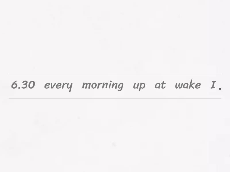 I wake up at 6.30 every morning. , I get up at 7.00am. , I brush my teeth and wash my face at 7.15am., I have my breakfast at 8am., I get dressed at 8.30am., I get the bus to school at 9.00am, I start class at 9.30am., I have lunch at 1.30pm., I finish school at 4pm., I play tennis at 5pm., I get home at 7pm., I have dinner at 7.30pm, I have a shower at 8.30pm., I read my book at 9.30pm, I go to bed at 10pm.,