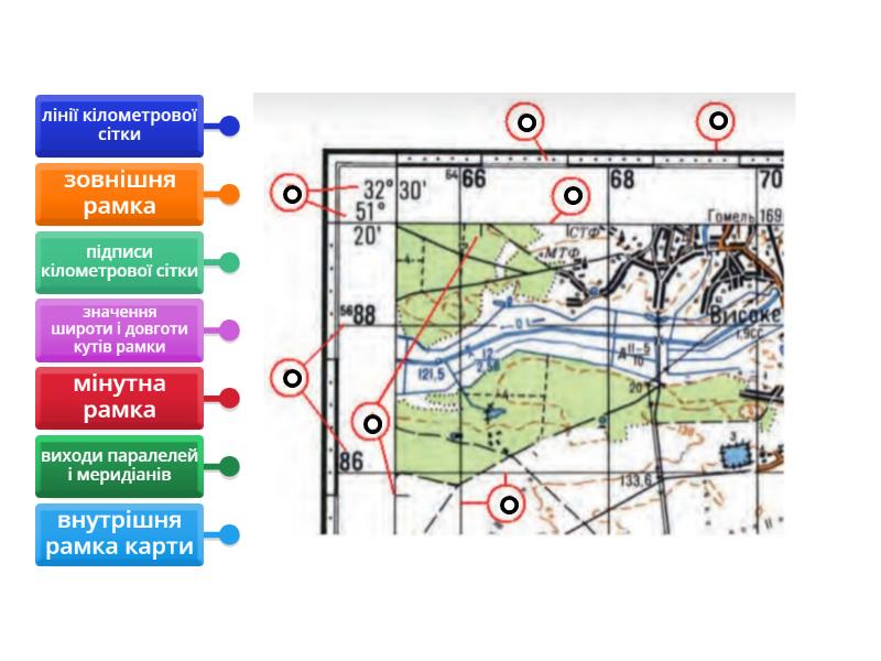 внутрішня рамка карти, мінутна рамка, зовнішня рамка, виходи паралелей і меридіанів, значення широти і довготи кутів рамки, лінії кілометрової сітки, підписи кілометрової сітки.