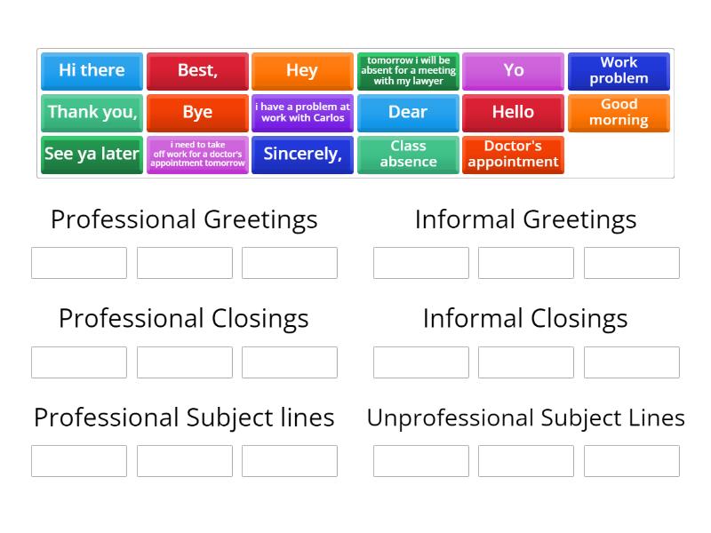 Professional Greetings: Dear, Hello, Good morning, Informal Greetings: Hey, Hi there, Yo, Professional Closings: Sincerely,, Best,, Thank you,, Informal Closings: See ya later, Bye, Professional Subject lines: Class absence, Doctor's appointment, Work problem, Unprofessional Subject Lines: i have a problem at work with Carlos, i need to take off work for a doctor's appointment tomorrow, tomorrow i will be absent for a meeting with my lawyer,