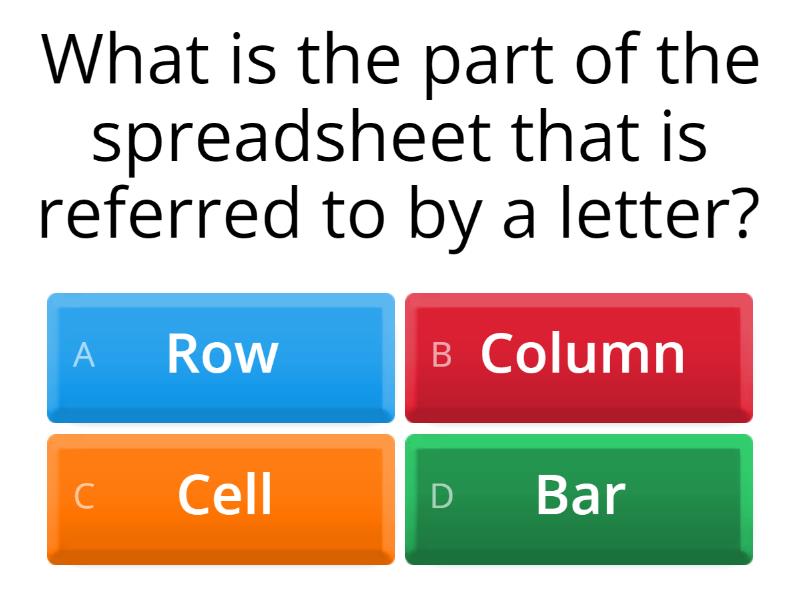 1) What is the part of the spreadsheet that is referred to by a letter? a) Row b) Column c) Cell d) Bar 2) What is the part of the spreadsheet that is referred to by a number? a) Row b) Column c) Cell d) Bar 3) A fill handle is used for... a) Replicating data b) Column c) Cell d) Bar 4) This cursor shape is used to... a) Merge cells b) Replicate columns c) Resize columns d) Splitting cells 5) Arranging data in a column in order from largest to smallest is called a) editing b) formatting c) sorting d) filtering 6) Which feature would you use to display data in a column according to specified criteria? a) Replicating b) Filtering c) Sorting d) Formatting 7) Which symbol must all formulas begin with? a) + b) / c) = d) * 8) Which formatting feature enables a user to join together data in several cells into one larger cell? a) Alignment b) Merge & Centre c) Wrap text d) Cell borders 9) How could you format this chart to make it easier to understand? a) Label the axis b) Delete the legend c) Insert gridlines d) Add a title 10) How would you format this chart to make it easier to understand? a) Remove the border b) Include a legend c) Change the colours d) Insert gridlines 11) Which type of chart would be the most appropriate to show the scores for these students? a) Line graph b) Bar chart c) Scatter graph d) Area chart 12) Which of these is the correct formula for an average? a) AVERAGE(A2:A8) b) =AVERAGEA2:A8 c) =AVERAGE(A2:A8) d) =AVERAGE(A2-A8)
