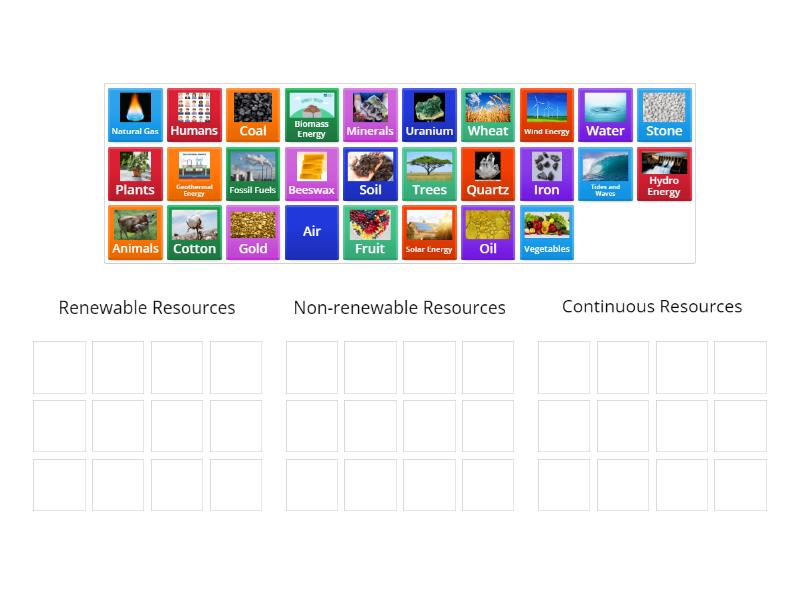 Renewable Resources: Water, Trees, Plants, Fruit, Vegetables, Cotton, Beeswax, Wheat, Animals, Humans, Air, Soil, Non-renewable Resources: Coal, Gold, Oil, Natural Gas, Stone, Uranium, Iron, Fossil Fuels, Quartz, Minerals, Continuous Resources: Solar Energy, Tides and Waves, Wind Energy, Hydro Energy, Biomass Energy, Geothermal Energy,