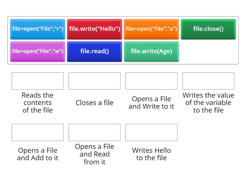 file=open("File","w") - Opens a File and Write to it, file=open("File","r") - Opens a File and Read from it, file=open("File","a") - Opens a File and Add to it, file.close() - Closes a file, file.read() - Reads the contents of the file, file.write("Hello") - Writes Hello to the file, file.write(Age) - Writes the value of the variable to the file,