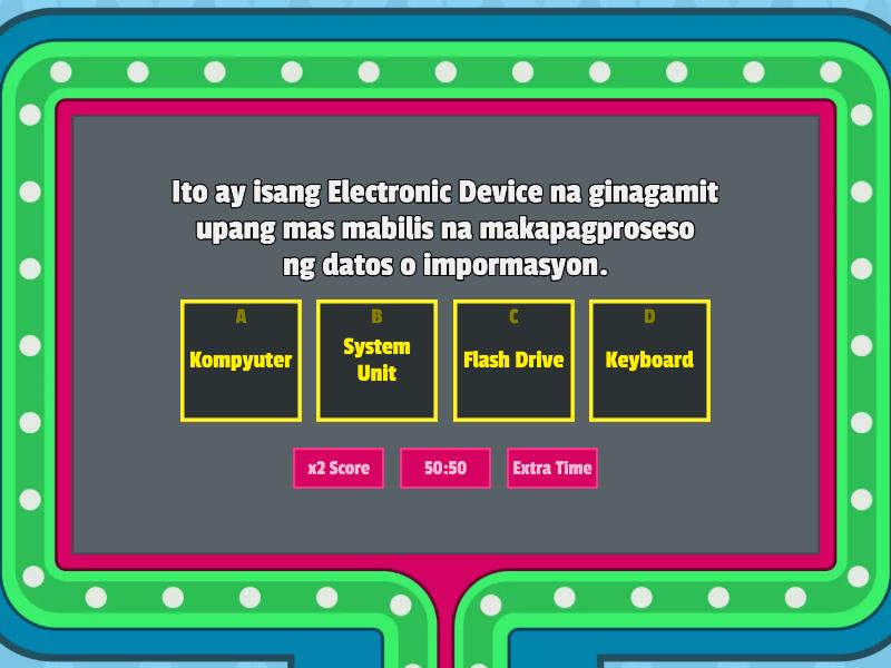 1) Ito ay isang Electronic Device na ginagamit upang mas mabilis na makapagproseso ng datos o impormasyon. a) Kompyuter b) System Unit c) Flash Drive d) Keyboard 2) Ito ay isang malawak na ugnayan ng mga Computer Network na maaaring gamitin ng publiko sa buong mundo. a) Email b) Internet c) Computer d) Smart Phone 3) Ito ay tumutukoy sa iba't ibang uri ng teknolohiya, gaya ng radyo, telepono, smart phone, computer at internet. a) Information, Communication and Technology (ICT)) b) Email c) Internet d) Smartphone 4) Sa pamamagitan nito ay mabilis na maipararating ang komunikasyon lalo na sa malalayong lugar o bansa.. a) ICT b) Internet c) Smartphone d) Email/messenger 5) Halimbawa ng produkto ng ICT na kaiba sa simpleng mobile phone na maaari ring makatulong  sa pagroseso ng impormasyon. a) ICT b) Smartphone c) Internet d) Flash Drive