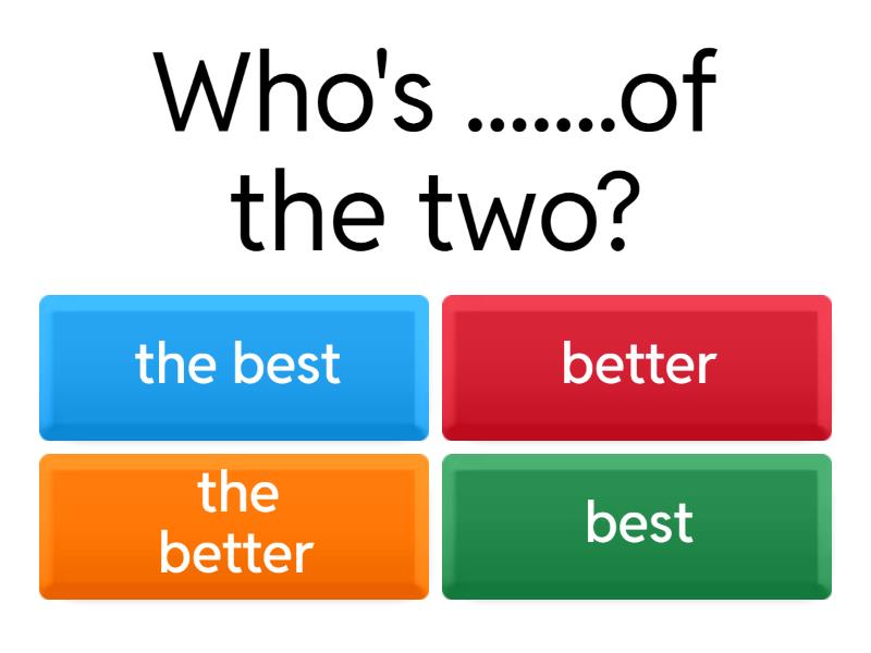 1) Who's .......of the two? a) the best b) better c) the better d) best 2) I have two friends: the .....is a pilot and ....is a doctor. a) first, the second b) former, the second c) former, the latter d) first, the latter 3) It is getting ...... a) colder and colder b) more colder c) more and more cold d) the coldest 4) Have you read my......book? a) last b) latest c) the last d) latter 5) I need some....information to move .....in this area. a) further, further b) farther, farther c) farther, further d) further, farther 6) I would really like to receive .....details about that story. a) fewer b) less c) least d) most 7) The .....you read, .....you know. a) more, more b) more, the more c) less, the more d) more, the fewer 8) This book is far.......than the movie. a) more interesting b) most interesting c) least interesting d) as interesting 9) This dress costs twice.......the shirt. a) more b) as much as c) less d) as more as 10) I would like to talk to your .....brother. a) older b) oldest c) elder d) more old 11) The ....half of last summer was very hot. a) former b) first c) second d) last 12) She is .....person I have ever met. a) shyer b) the shiest c) the shyest d) the shyer 13) I really don't know who is ......of the twins. a) the most strong b) the stronger c) the strongest d) the more strong 14) This city is getting ..... a) more and more big b) bigger and bigger c) biger and biger d) biggest 15) He can.....understand her ....work. a) hard, hard b) hardly, hardly c) hard, hardly d) hardly, hard 16) He is .....appreciated for aiming so ..... a) high, high b) highly, high c) highly, highly d) high, highly 17) I would like you to talk a bit..... a) less b) fewer c) least d) latest
