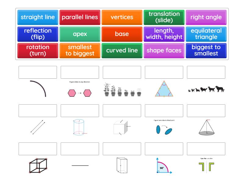parallel lines, right angle, curved line, straight line, equilateral triangle, shape faces, vertices, rotation (turn), reflection (flip), translation (slide), smallest to biggest, biggest to smallest, apex, base, length, width, height,