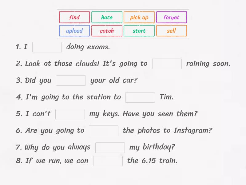 1. I ____ doing exams. 2. Look at those clouds! It's going to ____ raining soon. 3. Did you ____ your old car? 4. I'm going to the station to ____ Tim. 5. I can't ____ my keys. Have you seen them? 6. Are you going to ____ the photos to Instagram? 7. Why do you always ____ my birthday? 8. If we run, we can ____ the 6.15 train.
