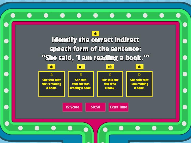 1) Identify the correct indirect speech form of the sentence: "She said, 'I am reading a book.'" a) She said that she is reading a book. b) She said that she was reading a book. c) She said she will read a book. d) She said that I am reading a book. 2) Choose the correct direct speech form of the sentence: He told me that he had finished his homework.  a) He told me, "I finished my homework." b) He said, "I have finished my homework." c) He told me, "I had finished my homework." d) He said, "I finish my homework." 3) Convert direct speech into indirect speech:"They are playing soccer,"he said.  a) He said that they were playing soccer. b) He said that they are playing soccer. c) He said that they had played soccer d) He said that they would play soccer. 4) Identify the correct indirect speech form of the sentence: "Will you help me?" she asked. a) She asked if I will help her. b) She asked if I would help her. c) She asked if you will help her. d) She asked if I can help her. 5) Choose the correct direct speech form of the sentence: He said that he couldn't come to the party.Choose the correct direct speech form of the sentence: He said that he couldn't come to the party. a) He said, "I couldn't come to the party." b) He said, "I can't come to the party." c) He said, "I can't coming to the party." d) He said, "I could not to come to the party."