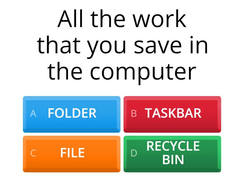 1) All the work that you save in the computer  a) FOLDER b) TASKBAR c) FILE d) RECYCLE BIN 2) Container of files a) PATH b) FOLDER c) FILE d) RECYCLE BIN 3) Shows files/folders in hierarchical order a) TASKBAR b) FILE EXPLORER c) F2 d) SUBFOLDER 4) A route to reach a particular folder or file in a drive a) SUBFOLDER b) SNIPPING TOOL c) COPY d) PATH 5) Folder within a folder a) FOLDER b) SUBFOLDER c) HARD DRIVE d) FILE 6) Shortcut for renaming a) MUSIC b) F2 c) PATH d) FILE EXPLORER 7) This contains all deleted files/folders a) RECYCLE BIN b) MUSIC c) SUBFOLDER d) HARD DRIVE 8) File Explorer icon lies on it a) HARD DRIVE b) MUSIC c) SUBFOLDER d) TASKBAR 9) Option to create duplicate files a) FILE EXPLORER b) SNIPPING TOOL c) RECYCLE BIN d) COPY 10) Non-removable disk for storing files a) SUBFOLDER b) TASKBAR c) COPY d) HARD DRIVE 11) Tool to capture screenshot a) SUBFOLDER b) HARD DRIVE c) SNIPPING TOOL d) FILE EXPLORER 12) Folder that stores audio files a) MUSIC b) COPY c) F2 d) TASKBAR