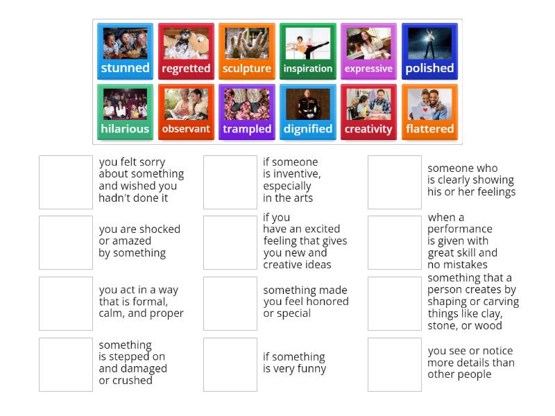 sculpture - something that a person creates by shaping or carving things like clay, stone, or wood, expressive - someone who is clearly showing his or her feelings, inspiration - if you have an excited feeling that gives you new and creative ideas, creativity - if someone is inventive, especially in the arts, dignified - you act in a way that is formal, calm, and proper, stunned - you are shocked or amazed by something, polished - when a performance is given with great skill and no mistakes, regretted - you felt sorry about something and wished you hadn't done it, hilarious - if something is very funny, observant - you see or notice more details than other people, flattered - something made you feel honored or special, trampled - something is stepped on and damaged or crushed,