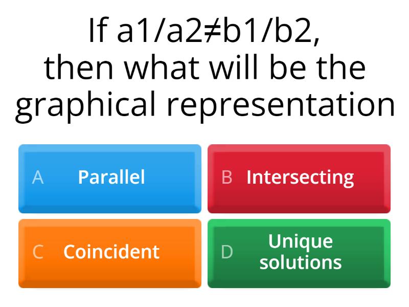 1) If a1/a2≠b1/b2, then what will be the graphical representation a) Parallel b) Intersecting c) Coincident d) Unique solutions 2) Two rails are represented by the equations x+2y–4=0 and 2x+4y–12=0. Will the rails cross each other? a) Yes b) No c) It’s not a common solution d) both (b) and (c) 3) A method where you eliminate one of the variables by adding the two equations. What is this method called? a) Substitution b) Cross multiplication c) Elimination method d) Matrix method 4) Given the two equations, 0.2x+0.3y=1.3 and 0.4x+0.5y=2.3. Identify x and y by substitution method. a) x=2 and y=3 b) x=3 and y=2 c) x=-2 and y=3 d) x=-2 and y=-3 5) What is the algebraic interpretation for a1/a2=b1/b2=c1/c2 a) Unique solutions b) Infinitely many solutions c) No solution d) All of the above