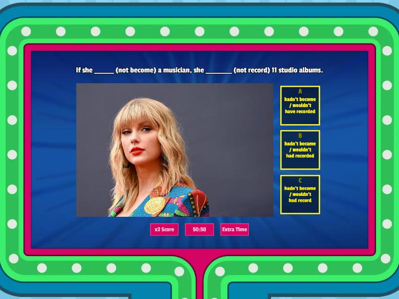 1) If she ______ (not become) a musician, she ________ (not record) 11 studio albums. a) hadn't become / wouldn't have recorded b) hadn't became / wouldn't had recorded c) hadn't become / wouldn't had record 2) If she _______________ (go) to art school, she __________ (become) a painter. a) had went / would had become b) had gone / would have become c) had gon/ would have became 3) If I __________ (be) born in a different country, I __________ (learn) to speak a different language. a) had been / would had learned b) had be/ would have learn c) had been / would have learned 4) If she __________ (not take) the job, she _________ (go) travelling. a) haven't taken / would have went b) hadn't taken/ would have gone c) hadn't took / would have gone 5) If we ___________ (not go) to the party, we _______________ (not/meet) a new group of friends. a) haven't go / would had met b) hadn't gone / would have meet c) hadn't gone/ wouldn't have met 6) He __________ (be) happier if he ____________ (stay) at home. a) would have be / had stayed b) would have been / had stayed c) would had been / had stood 7) If he ________________ (try) harder, he _______________________ (finish) the test by now. a) tried / would had finished b) have tried / would have finish c) had tried / would have finished 8) If we __________________ (eat) that seafood, we ____________________ (get) sick. a) didn't have eaten / would have got sick b) hadn't eaten / wouldn't have got sick c) haven't eaten / wouldn't have got sick 9) It ____________________ (be) better if you __________________ (not buy) that old car. a) would have been / hadn't bought b) would had been / hadn't bought c) would have been/ hadn't buyed 10) If I _______________________ (write) to you sooner, you _________________ (not feel) so lonely. a) had writed / wouldn't have felt b) had written / wouldn't have felt c) had writing / would have felt